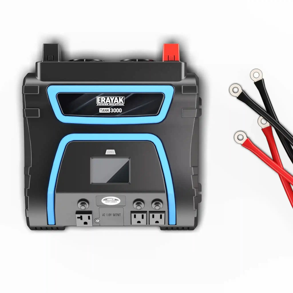 The Newly Upgraded High-Power Inverter – The Erayak TANK3000 delivers 3000W continuous and 6000W surge power. With two AC outlets (20A and 15A) plus direct-connect terminals, it easily powers refrigerators, microwaves, tools, pumps, and serves as reliable backup power for emergencies or off-grid use.